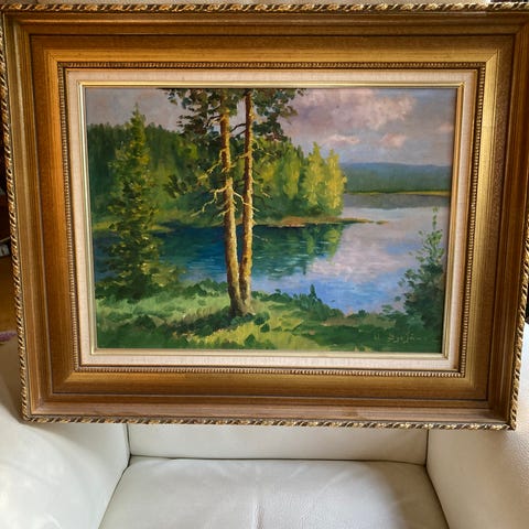 Taulu järvimaisema kultakehyksissä, koko 42 x 32 cm, 10 e