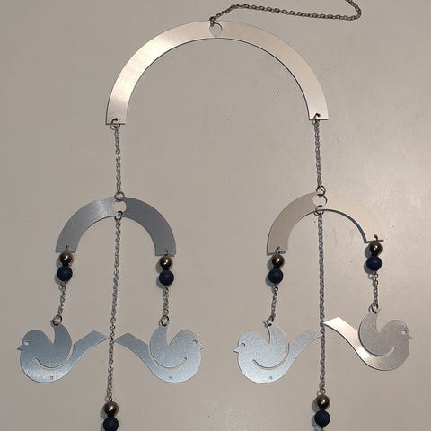v. 1990 Aarikan kuvastossa. Mobilen pituus ketjuineen on 78 cm ja kuvion osuus 23 cm.