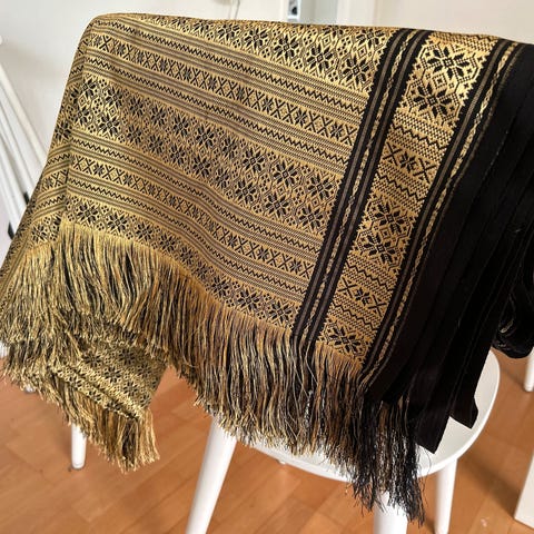 Värikäs huivi/liina/tekstiili ilmeisesti Bhutanista, olen saanut tuliaisiksi sieltä vuosia sitten. Tekstiilissä ei ole mitään lappuja. Vähän käytetty, käytetty joskus liinana hyllyn päällä. 26,5 cm x 169 cm.