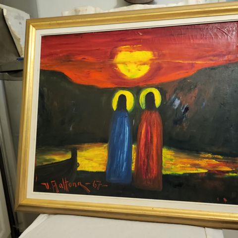 Mikko Mattilan öljyvärityö "Hämärän tytär" vuodelta 1975. Kehyksen korkeus on 97 cm ja leveys 55 cm.