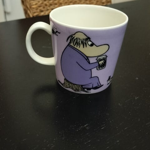 Hemuli muki, käytössä ollut. Ks. Värjäymä, ei lähde tiskikonepesussa. Ei yritetty muuten putsata. Muuten hyvä kunto.