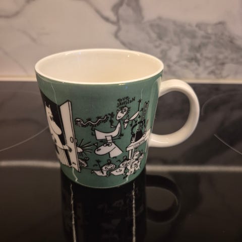 Vanha muki ja käytössä ollut. Kuvassa käytön jälkiä, sisältä siisti. Yritin kuvata huomaamani jäljet tarkasti, katso siis kuvat hyvin. Ns. Nimilappukuva pyydettäessä.