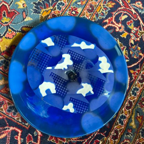 Täysin ehjä lautanen. Signeerattu: Kerttu Nurminen Nuutajärvi Notsjö 87/1000. Halkaisija 29 cm.