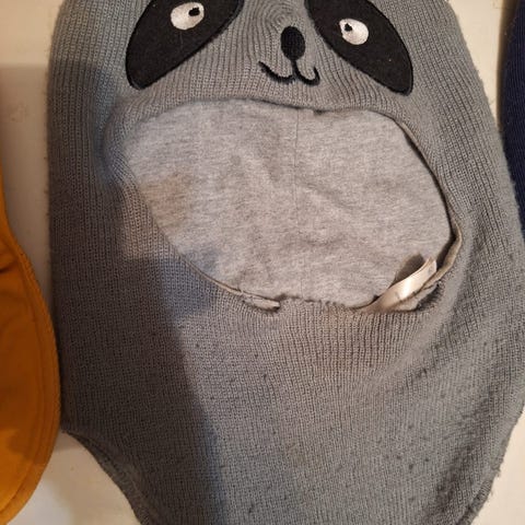 Paljon käytetty ja rakastettu, edelleen lämmin ja pehmeä. Nukkaa löytyy ja kasvojen aukko hieman venähtänyt, ei haitannut meillä käyttöä.
