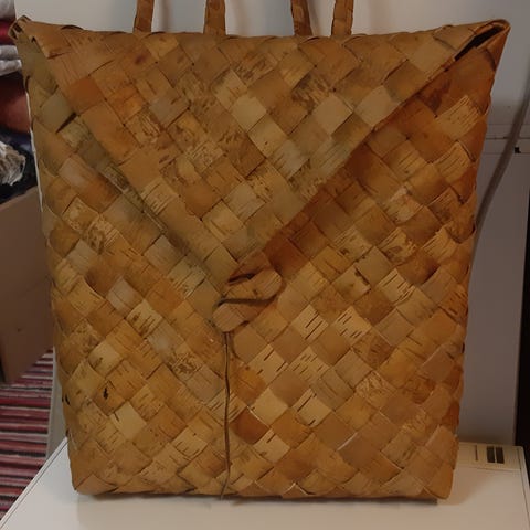 Suuri tuohikontti. Koko noin 50x38cm. Yläosasta ollut naulalla kiinni, josta kontti hieman haljennut, mutta ei näy pahasti.