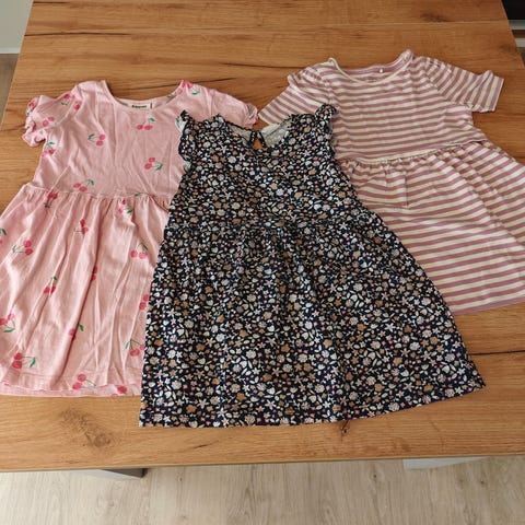 Paljon käytetyt kesämekot. Yhdessä sauma vaatii korjausta ja toisesta jo reikää parsittu. Hyvin menee vielä leikeissä eikä tartte pelätä että likaantuu! H&m:n mekoissa koko 98/104, mutta pientä kokoa, Tutan mekko reilu 92.