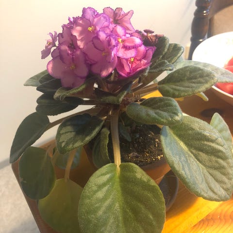 Kuvan kaltaisia vaaleanpunaisia kerrottuja saintpaulioita/Paavalinkukkia 10cm valkoisissa ruukuissa.