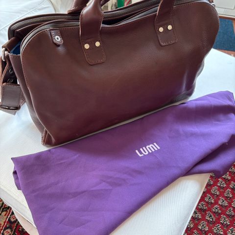 Upea, erittäin hyvä kuntoinen, vain pari kertaa käytetty matkakassi, aitoa nahkaa. Sisävuori ja olkahihna puuvillaa. Molemmissa päissä läpälliset taskut ja sivussa solkien koristama pitkä tasku; kaikki magneettikiinnityksellä. Sisäpuolella yksi vetoketjutasku ja kaksi avotaskua. Säädettävä, tukeva ja irroitettava olkahihna, jossa nahkainen tuki olkaa vasten.