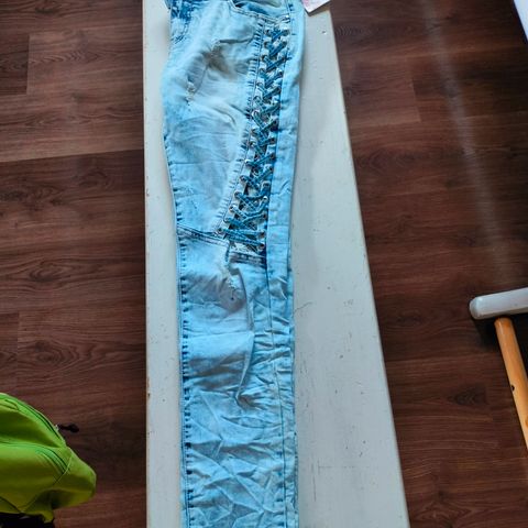 Uudet farkut kivoin yksityiskohdin. Kokomerkintä M mutta pientä mitoitusta. Eläintalous.