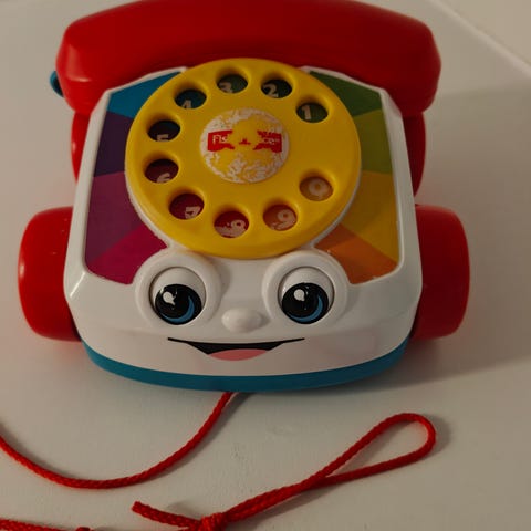 Fisher Price merkkinen perässä vedettävä puhelin. Silmät liikkuu vedettäessä. Ääni kuuluu pyöritettäessä numerovalintaa. Kulumaa. Kissatalous. Nouto Viirinkangas.