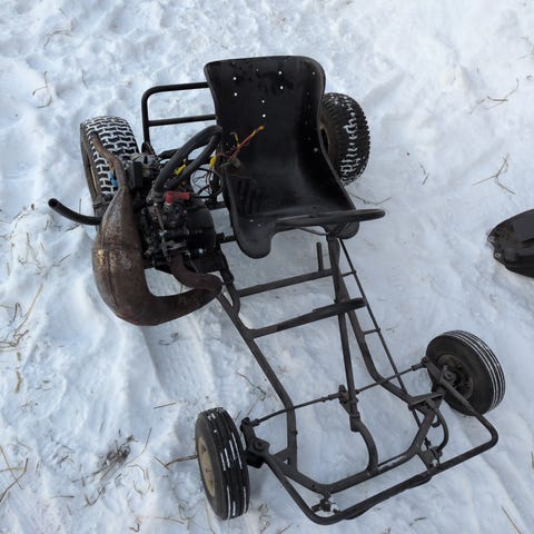 Ihan ok kunnossa oleva mikroauto/ sisäkarting auto. Järeä runko kantaa isommankin kaverin ja mukaan penkin sisäsovitin pienemmälle kuskille. Vaatii pientä laittoa/säätöä. Koneremonttia tehty muutama vuosi sitten esim. Kiertokanki ja kampiakseli ja laakerit. Hondan kone. Jotain osia ja renkaita mukaan ja piikki/nasta renkaat. Saa tehtä tarjouksen ja tarjota vaihtoa johonkin.
