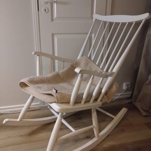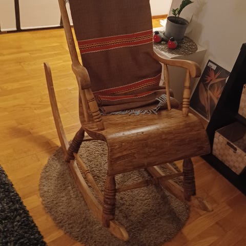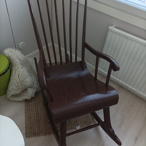 Lyhyemmällä selkänojalla varustettu vanha keinutuoli. Keinutuoli on tosi vanha, mutta ikäisekseen hyvässä kunnossa, maalipinnoissa sanomista. Myydään varaston siivouksen jaloista pois 50e/tarjous
