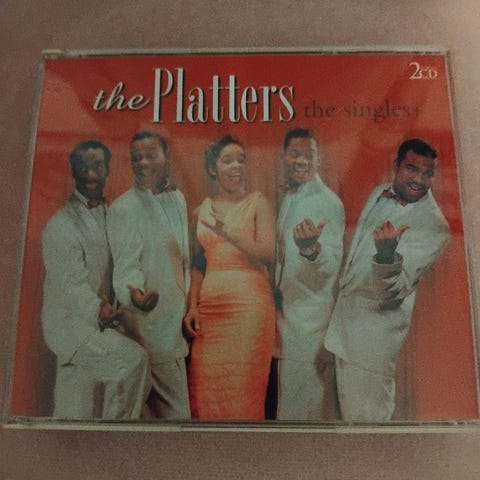 The Platters -albumi 'The Great Pretender' on CD-formaatissa. Albumi sisältää useita klassikkokappaleita, kuten 'Smoke Gets in Your Eyes' ja 'Only You'. Monipuolinen kokoelma tarjoaa nostalgisia sävelmiä yhtyeeltä, joka on tunnettu harmonisista vokaaleistaan. Voi lähettää