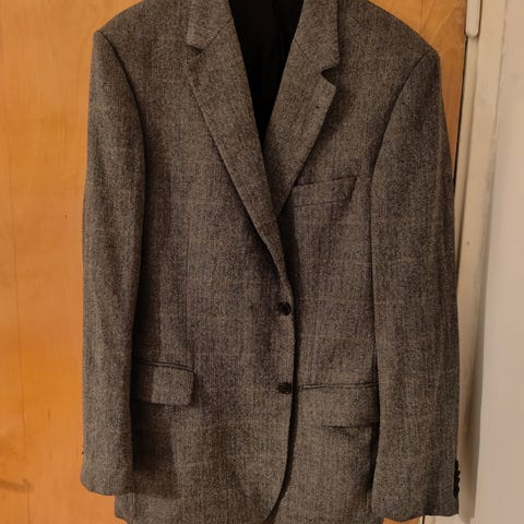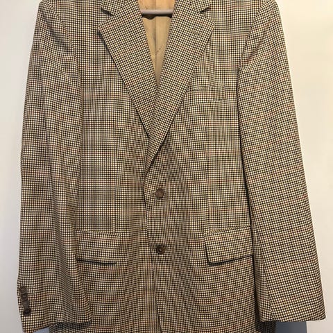 Takissa on kaksi etunappia, paikkataskut, takana yksi halkio ja hihansuissa kaksi nappia (eivät avaudu). Koska takki on vähintään 35 vuotta vanha, kankaassa on pientä kulumaa siellä täällä. Virheitä huomaa tosin vain silloin, kun niitä etsimällä etsii, koska kuviointi piilottaa ne todella hyvin.