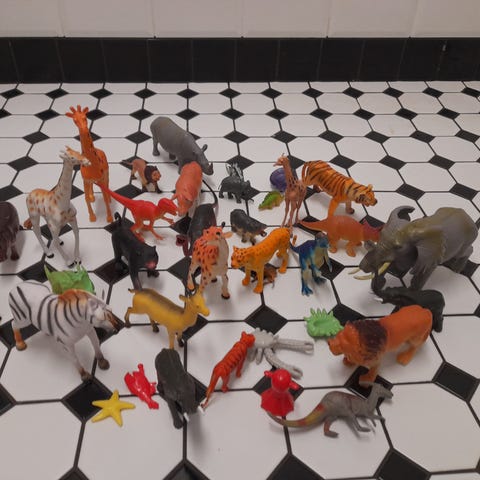 Seitsemän kappaletta muovieläimiä. Kuvassa oikealla olevalla elefantilla on kärsä kärsinyt, mutta eläimet muuten hyvässä kunnossa.