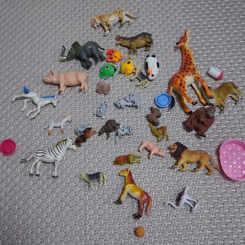 Seitsemän kappaletta muovieläimiä.