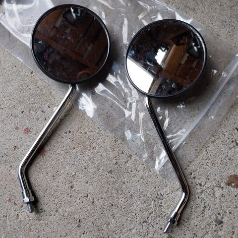 Alkuperäiset peilit ja etuhaarukan heijastimet Skyteam Monkey E5:een. Oikean puoleisen peilin kierteet rikki.