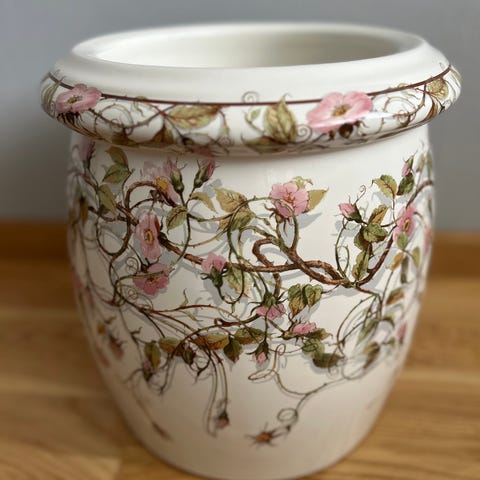 Lasitettua posliinia ja pronssia tai pronssipinnoitus. Painaa melko tolkuttomasti, eli tarvitaan kaksi kantamaan. Toisaalta matkustanut muutossa auton takapenkillä kumollaan oikein näppärästi.
