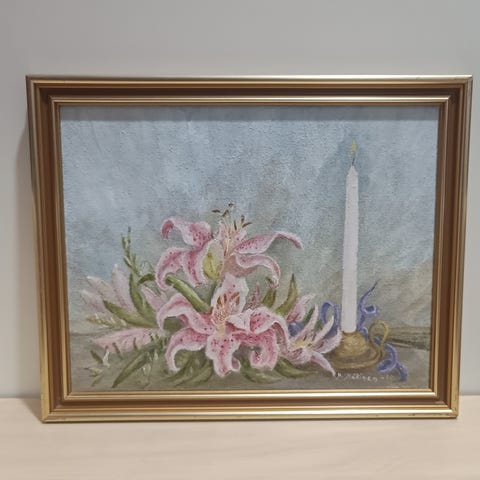 Kaunis kuusi laattainen taulu, jossa liiloja kukkia. Taulussa kauniit kehykset ja saa ripustettua seinälle takana olevan rautalangan kanssa.