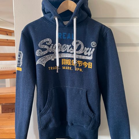 Musta huppari etutaskulla. Punainen Superdry-logo edessä, hieman nyppyyntynyt. Väri hieman haalistunut käytössä.