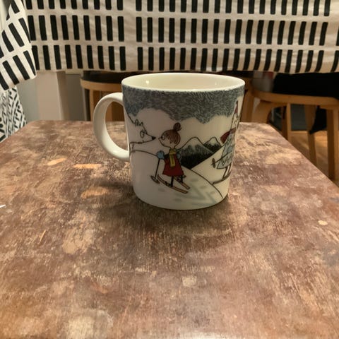 Muumimuki Hiihtäen kera herra Virkkunen (2014). Talvi sesongin muki. Käytetty muutaman kerran, ei jälkiä.