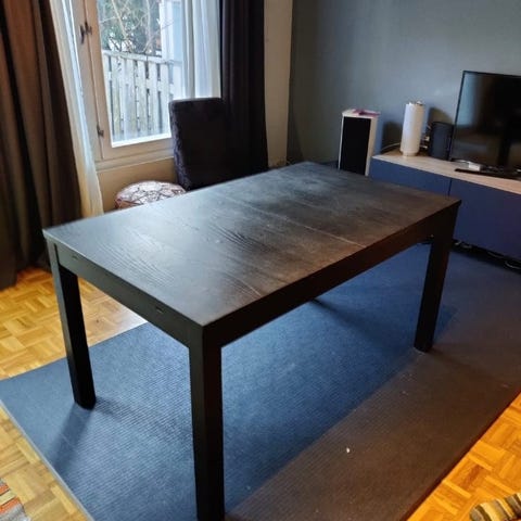 Hyväkuntoinen ruokaryhmä. Neljän istuttava pöytä 140x60cm plus pidennyspala jolla pöydästä saa kuuden istuttavan. Neljä tuolia. Pöydän pinnassa kulumaa, jonka saa hiekkapaperilla ja puuöljyllä/lakalla korjattua. Voin antaa puuöljyn mukaan.