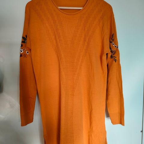 Sivuilla halkiot. Hihoissa brodeeraus (joissain kohdissa brodeerauksessa langanpäät pilkottavat). Neule on hieman läpikuultava etuosan kuvioiden kohdalla.
