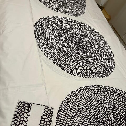 Kaunis sinivalkoliila Marimekon Ananas - pussilakanasetti yhdelle hengelle: pussilakanasetti 150 x 200 ja tyynyliina 50 x 60.