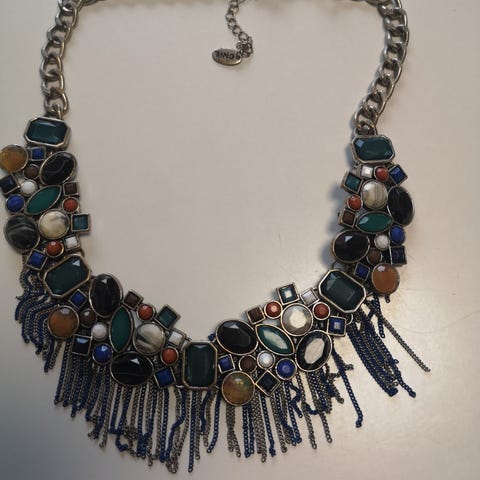 Myydään kuvanmukainen kaulakoru, metallia. Pinta kuluneen näköinen, kuuluu ilmeeseen. Suht painava. Metallineliöiden keskellä pienet kirkkaat kivet. Nouto tai toimitus 9 euroa.