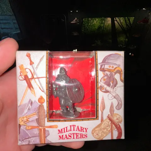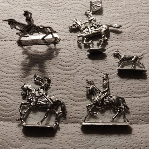 Vanhoja muotilla valettuja tinasotamiehiä ja ratsu