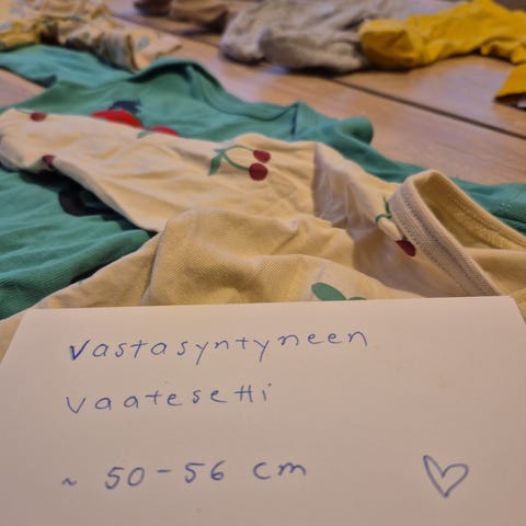 Vastasyntyneen vaatepaketti 50 - 62 cm. Ollut käytössä useammalla lapsella, joten nyppyä, pikku tahraa ynnä muuta huomautettavaa löytyy varmasti. Nepparillisesta yökkäristä puuttuu yksi neppari. Zara puvussa koko 68 cm mutta vastaa pienempää.