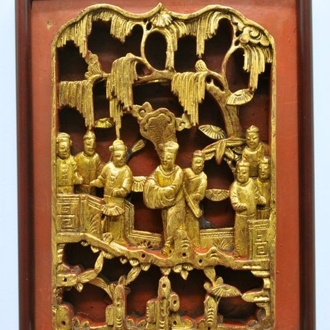 Kiinassa käsin kaiverrettu puureliefi, maalattu ja kullattu.
