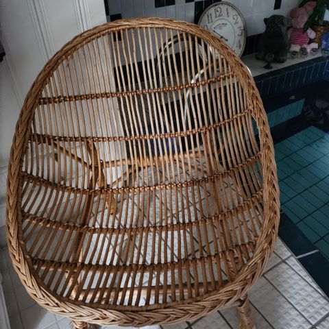 Myyntiin rottinki/peacock tuoli. Ylhäältä rottinki purkautunut, väri haalistunut ajan saatossa, itselle kelvannut tällaisena. L 100cm. K 135cm istuin korkeus 45cm istuin leveys 38cm. Kuvan muut tavarat eivät kuulu kauppaan.
