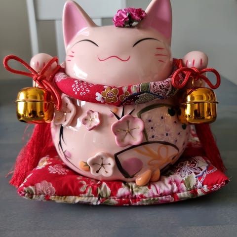 Musta posliininen kissakoriste/pankki. Lepää koristetyynyn päällä. Korkeus 9cm, leveys 11cm. Ollut koristeena vitriinissä.