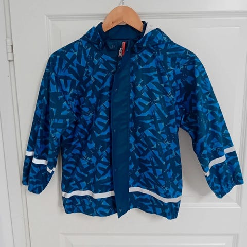 H&M:n sadetakki 130 ja Bogi-sadehousut 128/134 ovat hyvässä kunnossa, mutta niissä on käytön jälkiä. Ei ole reikiä, ja housuissa on värinmuutosta (katso kuva). Sisällä ei ole fleeceä.