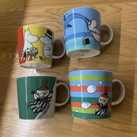 8 kpl erinomaisessa kunnossa olevia Muumimukeja. Mukeissa ei ole käytetty lusikoita tai muuta sisällä, ei siis mitään jälkiä mukien sisäpinnalla.