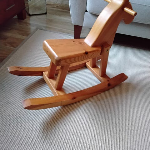 Täyspuuta, kestävä ja jykevä keinuhevonen.