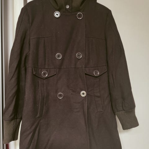 Steilmann-villakangastakki, syksy/talvi, tumma lila, pehmeä, musta tekoturkiskaulus ja hihansuut, napit, nepparitaskut, sileä vuori, koko 44, designed in Germany, siisti, hyväkuntoinen, 70% villa, 20% nailon, 10% cashmir.