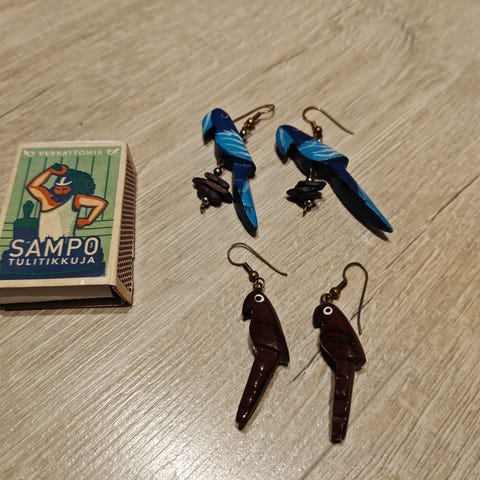 Puiset papukaijakorvakorut höyhenillä