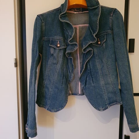 Luonnonvärinen farkkutakki, kaksi läpällistä nappitaskua. Helmassa säätömahdollisuus napeilla. Hihoissa napit.
