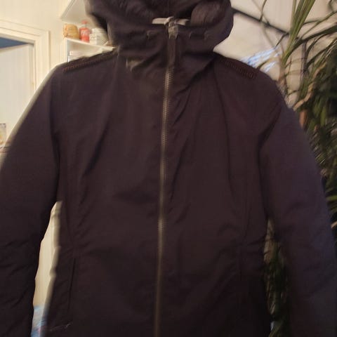 Lämmin ja muhkea. Korkea kaulus, kaksi taskua edessä, yksi sisätasku.