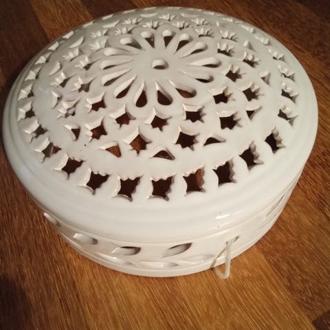 Suuaukossa kaksi pientä hiuksen hienoa hiusmurtumaa (ks. kuvat), jotka eivät näy käytössä. Muuten kupu on ehjä kauttaultaan (joitakin näkyviä ilmakuplia kuvussa on, jotka ovat tulleet tekovaiheessa).