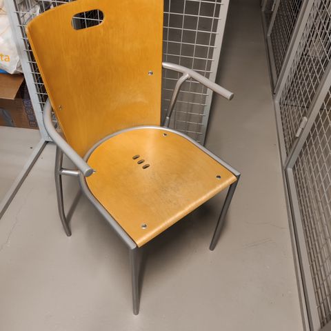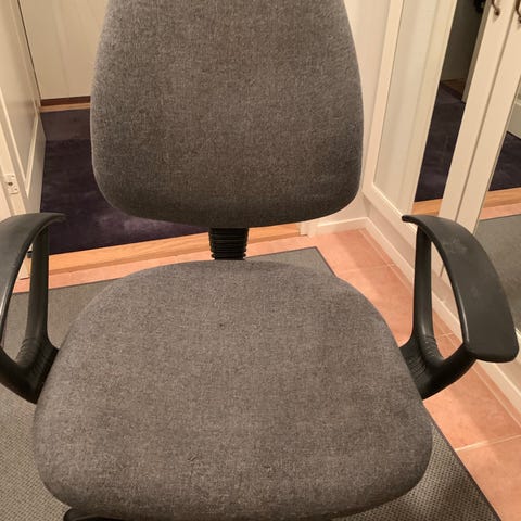 Annetaan musta työtuoli. Hyväkuntoinen, jämäkkä ja ehjä, mutta pinnassa jonkin verran pistejälkiä. Istumakorkeus säädettävissä 45cm-56cm välillä.