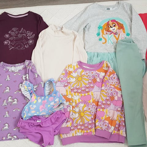 Paketissa mm. paitoja, mekkoja, leggareita, verkkarit, caprileggareita, fleecetakki, asusteita jne. Merkkeinä mm. H&M, Lindex, Name It, Zara.