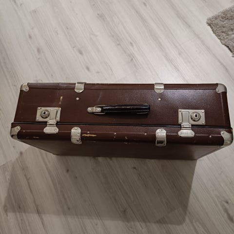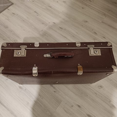 Korjausta vaativa tyylikäs ja vanha matkalaukku, ostin joskus projektiksi mutta en saanut korjattua. Sisustoja pitäisi liimata ja avain tehdä. Täysin korjattuna hinta olisi monin kertainen.