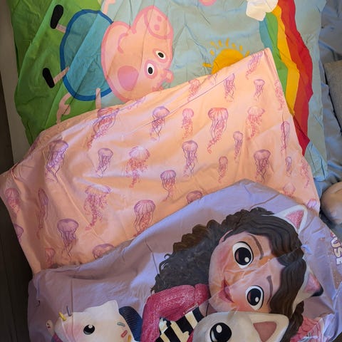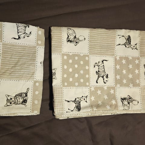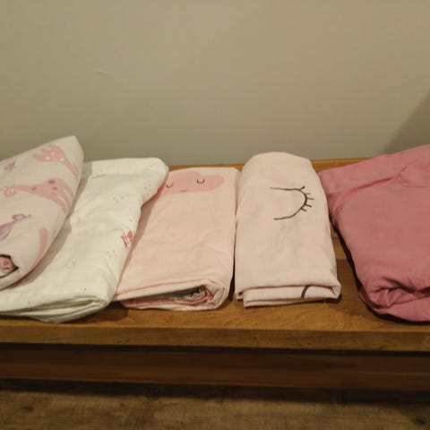 Vaaleanpunainen pussilakana (95x65) ja tyynynliina (35x45) ja muotoon ommeltu valkoinen aluslakana (120x60). Aluslakana ei enää kirkkaan valkoinen, muuten pussilakanat siistit.