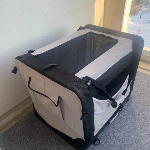 Käyttämätön, pyöreä kokoon taitettava kevythäkki, auton takapenkille kiinnitettävä. Halkaisija n. 64 cm.