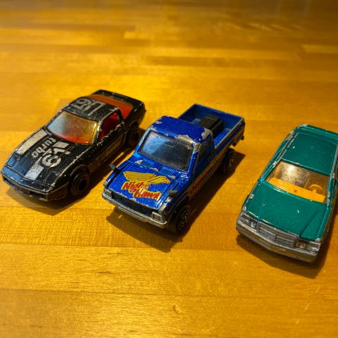Raikkaan värinen pick-up. Tomte malli nro 14. Selkeästi maileja takana, pientä kolhua siellä täällä ja runkokin vaikuttaa pikkasen kierolta.