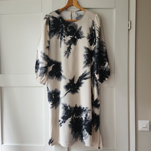 Kuusama mekko koossa XL, väritys harmaa ja musta. Kevyt,hyvin laskeutuva mekko. Suora malli,frilla helmassa. 3/4 hihat,halkio niskassa jossa nappikiinnitys. Vähällä käytöllä ollut mekko on moitteettomassa kunnossa. Materiaali ei jousta. Mitat; RL 56,pituus 100cm. Koko sopii parhaiten 38+ ja 40-42, myös 44-