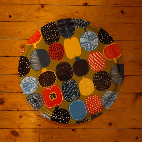 Pyöreä Fokus-tarjotin on ajaton klassikko. Materiaali: vaneria. Halkaisija 46 cm.
